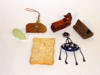 Of typical shaped tall rectangular form, carved in detailed low relief, together with four other table items.