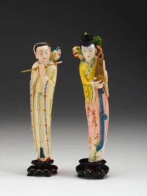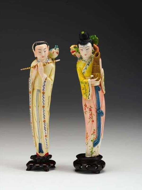 Both of slight convex from, well carved and colored, one missing top-knot, over wood stands.