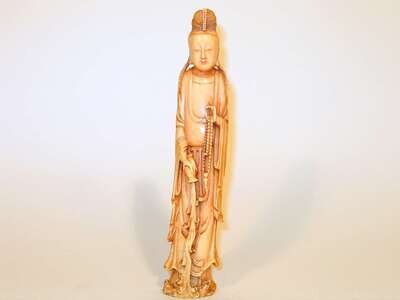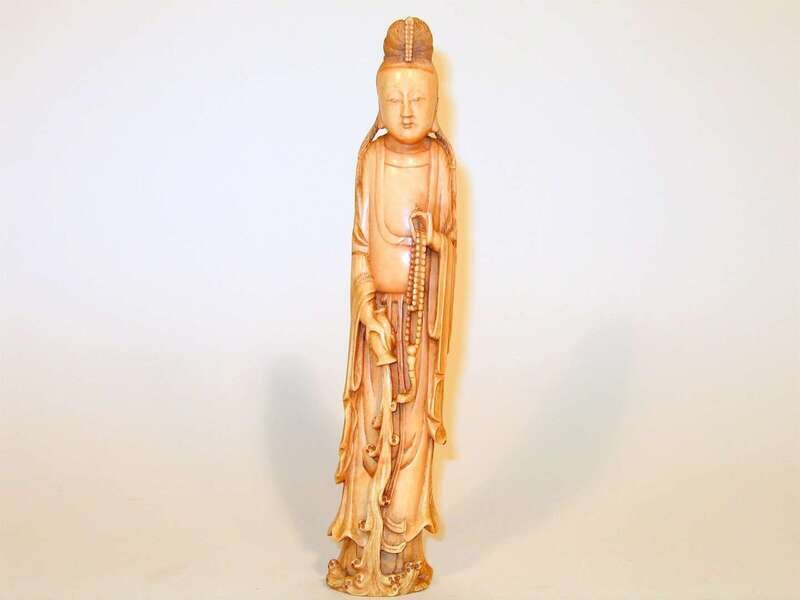 Of slight convex form, carved in high relief to show hands clasped near body holding beads and flowing vase, scrolling base.