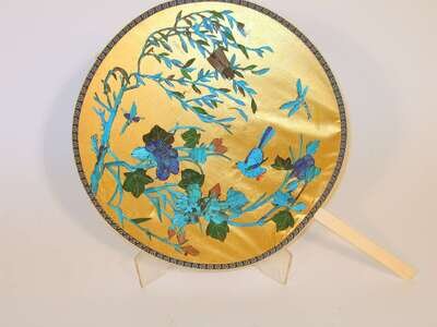 Comprised of a gilt-paper feather decorated head over ivory handle, together with ivory guard, embroidery fan.