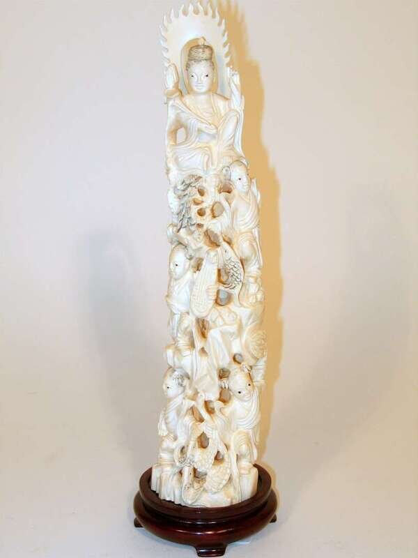 Of slight convex form, worked to show seated Quanyin over figural and foliate base, wood stand.