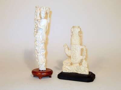 Comprised of a tall convex ivory figure, worked holding a lantern, together with a phoenix vase, no cover, both on stands.