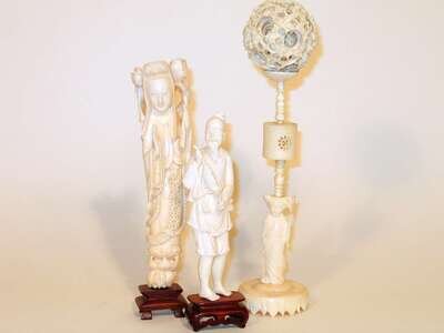 Comprised of a tall Quanyin figure over wood stand, fisherman figure, together with a reticulated ball on pedestal stand.