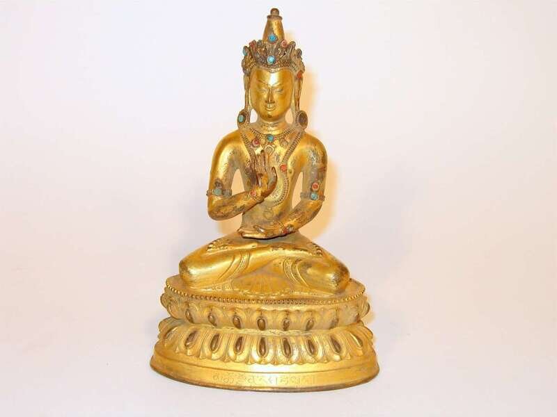 Sino-Tibetan gilt bronze and jeweled model of Buddha