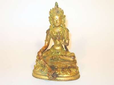 Cast to show crown, serene expression, seated over double lotus throne.