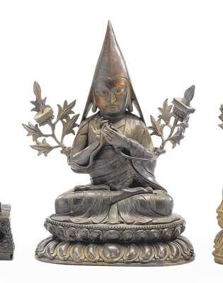 Seated on a double lotus throne, hands in dharmachakra, holding stems of two flanking lotus flowers, monastic robe and peak head dress.