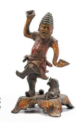 Single section casting, standing male figure with unusual hoof feet, dancing with Fu lion cub, over bracket base.