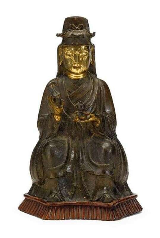 Chinese gilt bronze partially gilt bronze Quanyin figure on wood stand possibly 17th century