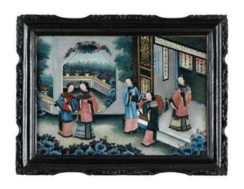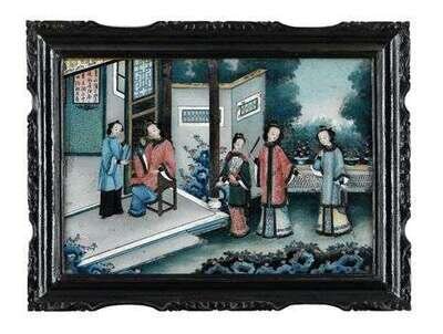 Of long rectangular form, well painted figural court scenes, ebonized frames.