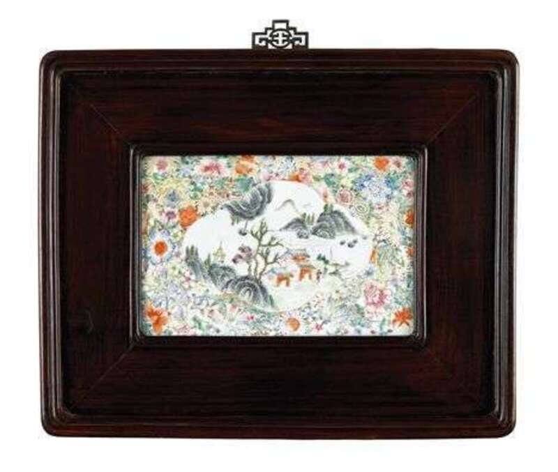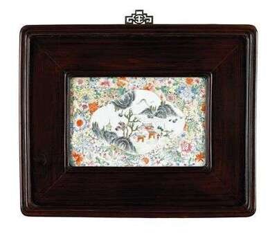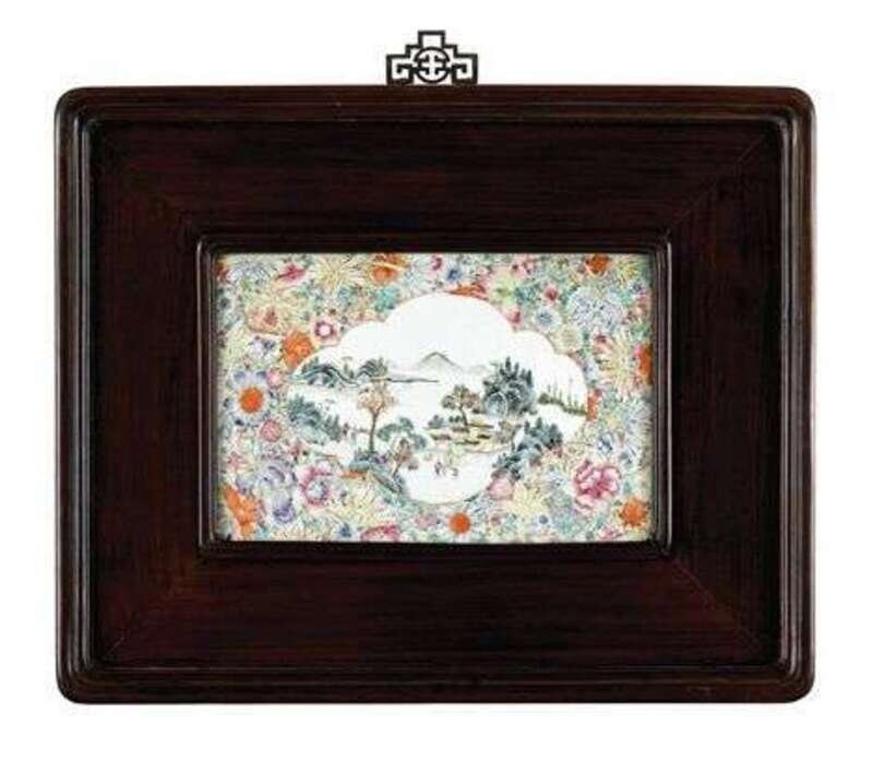 Of rectangular form, famille rose landscape cartouche enclosed by mille-fleurs ground, hongmu beveled frame and hanging hook.