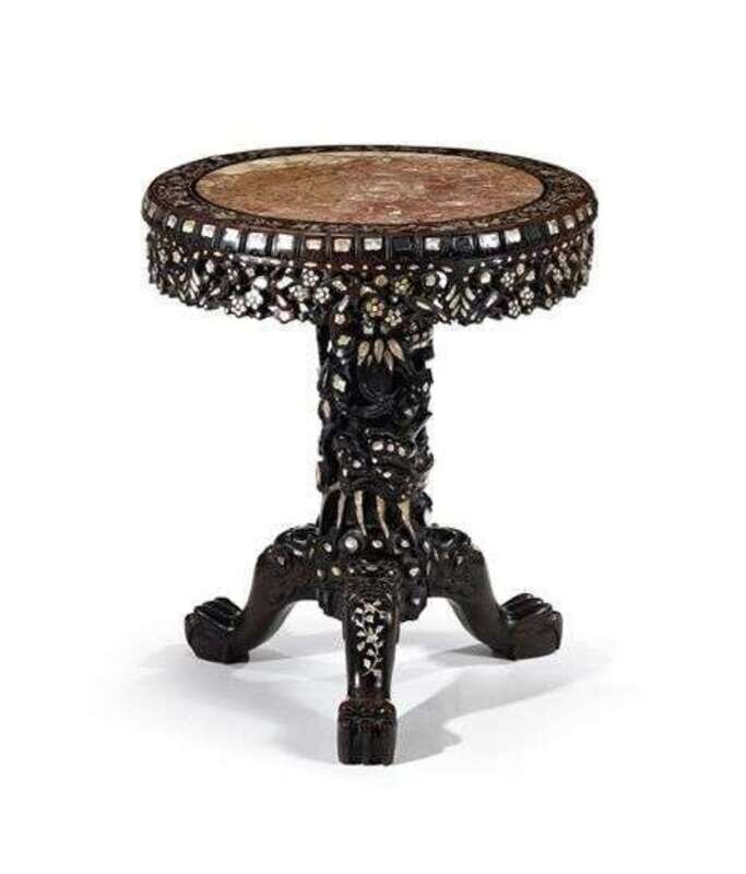 Chinese hongmu, mother-of-pearl inlaid and marble insert table late 19th century