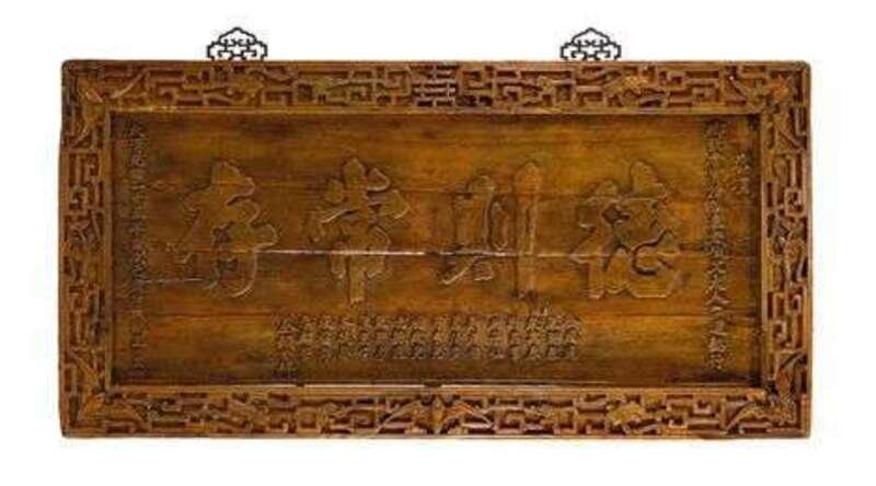Of long rectangular form, well incised script in medium relief within a scrolling border, metal hanging hooks.