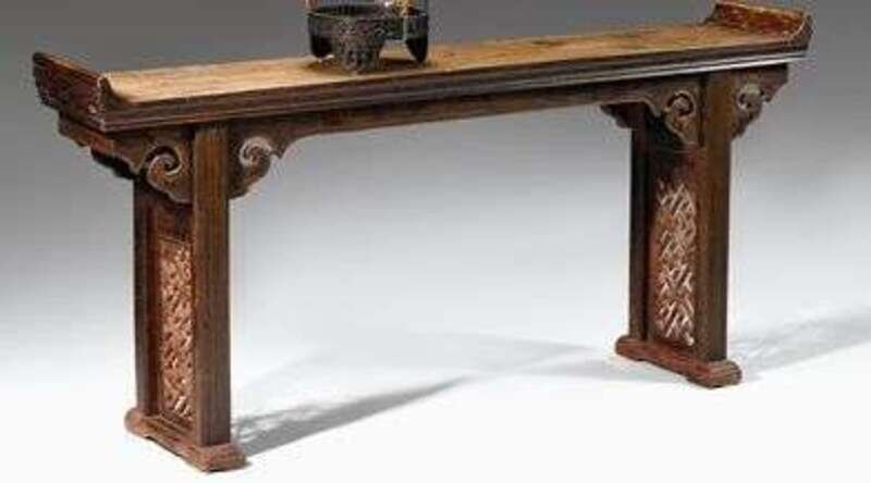 Of long narrow form, scrolling flange ends, lattice paneled straight legs, signs of red lacquer.