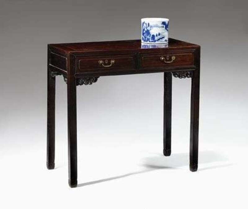 Of rectangular form, beaded twin drawers to frieze over shaped spandrels and straight beaded legs terminating in hoof feet.