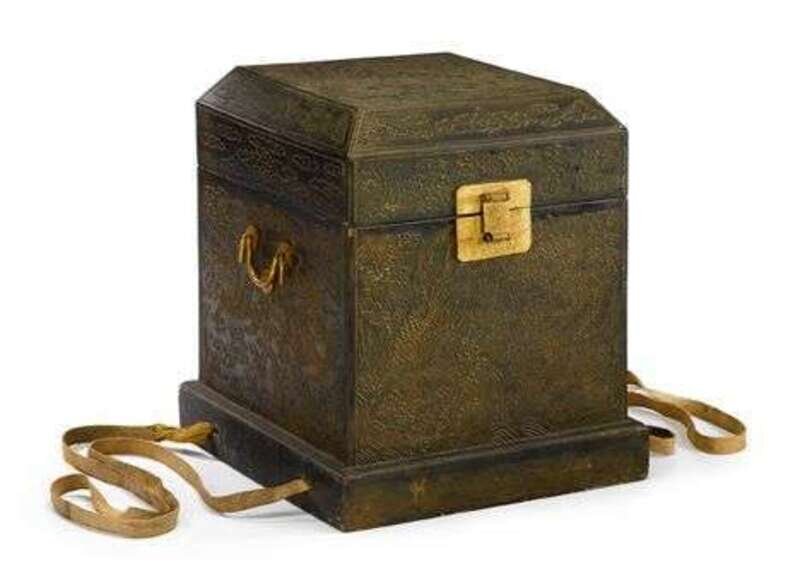Of square form, paneled domed and hinged cover, over a square base on plinth, woked to show scrolling dragons over lishui, good gilt-metal mounts, with binding.