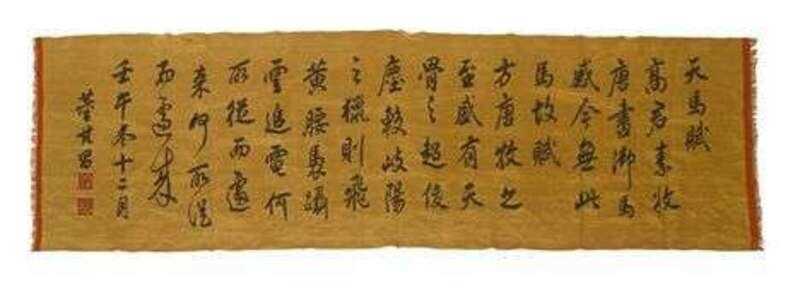 Long Chinese yellow ground and calligraphy kesi panel two seals, 19/20th century