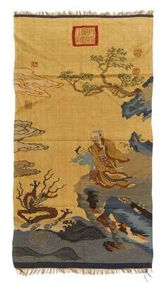 Of tall rectangular form, worked to show scholar and attendant over rock-work, coiling dragon and various seals all over a yellow ground.