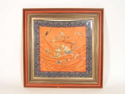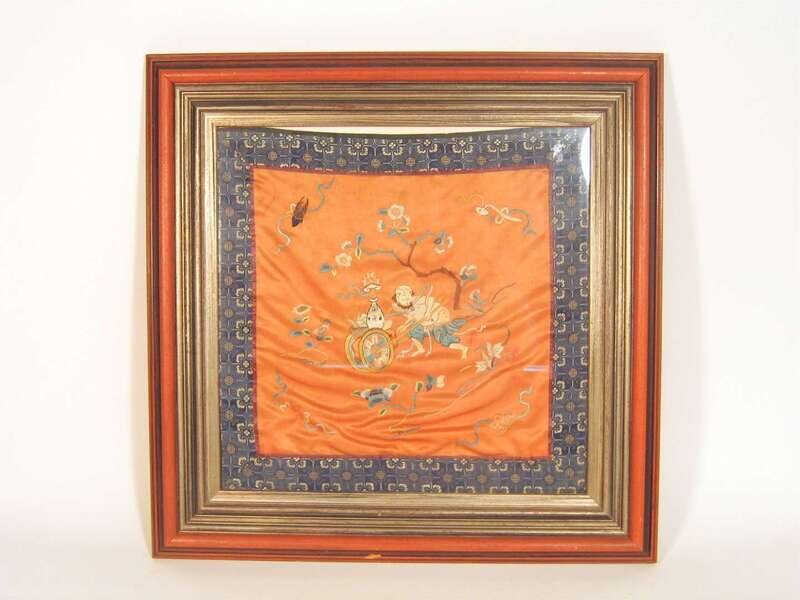 Glazed and framed, square panel of silk embroidery showing a street peddler on orange ground framed by silk brocade.