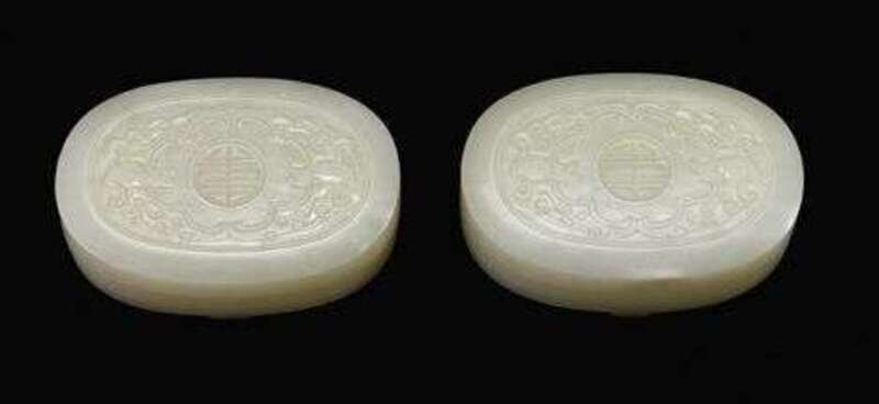 Fine pair of Chinese white jade covered oval boxes 19th century
