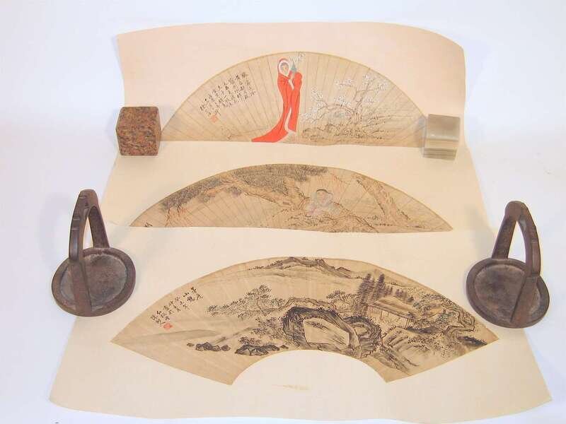 Laid down on board, color wash and ink on paper, depicting figural landscapes.