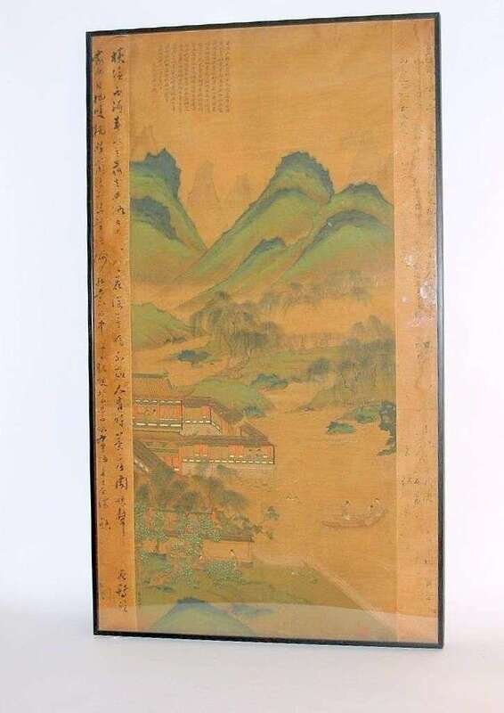 Color wash and ink on silk to show mountainous landscape, detailed poetic script to body and framing panels, seals of Mao Yuan and Wen Jia, glazed and framed.