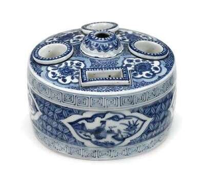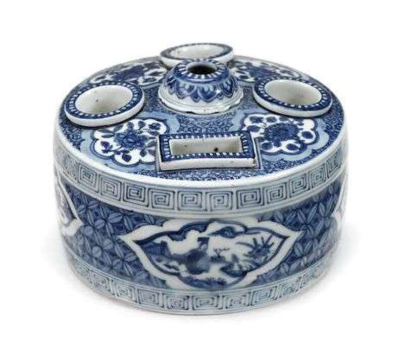 Of cylindrical drum form, the slightly convex top recessed with three circular brush pots, rectangular ink pot and a central water pot, all with molded covers, painted to show four lotus cartouches enclosing sprigs, the body is slightly recessed framed by two Greek-key bands, painted to show four cartouches of scholar and attendant over three matched and one similar detailed foliate ground, unglazed raised foot, glazed base.