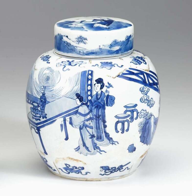 Straight edge cover painted to depict a boy , the rounded tapering base molded with eight petal bands to collar and base, painted to show Buddhistic symbols, the body well painted to show court beauties and rock-work.