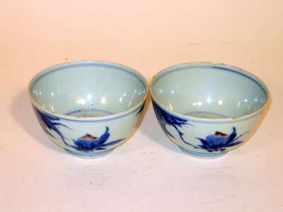 Good pair of Chinese copper-red and blue underglazed bowls lingzhi mark, kangxi period