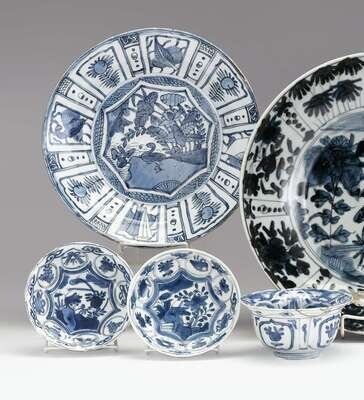 Comprised of two saucers painted to show a central medallion of insects and sprigs within a band of eight Buddhistic symbols, high walled bowl with old repair and large dish decorated in a similar manner.
