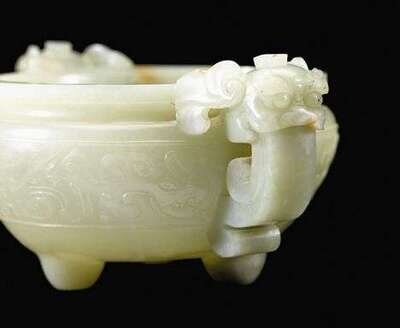 Translucent white/light-celadon tone, of deep U-shape waisted rim flanked by two mask handles supporting scrolling lugs, body very finely carved in low relief to show archaic masks and scrolls within two bands, raised on three tripod feet, slight white and brown inclusion.