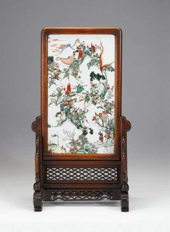 Porcelain screen of tall rectangular form, detailed enameled and iron-red decorated scene of horseman and processions, huanghuali frame and stand.