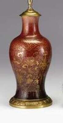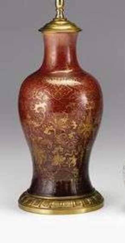 Converted into a lamp, good strawberry hue thin near mouth darker towards base, slight crazing under glaze, well painted Indian lotus and ruyi collar to body, good heavy gilt metal mounts.
