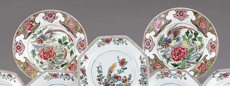 Pair of Chinese export ruby ground and enameled plates 18th century