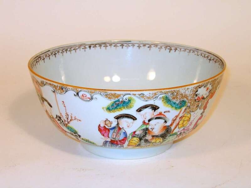 Of deep U-shape form, outer wall well enameled to show ladies of the court and figural landscapes, minor crazing.