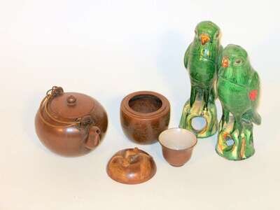 Parrots of typical Kangxi form, together with a yixing cup enclosed within a fruit form jar, and teapot.