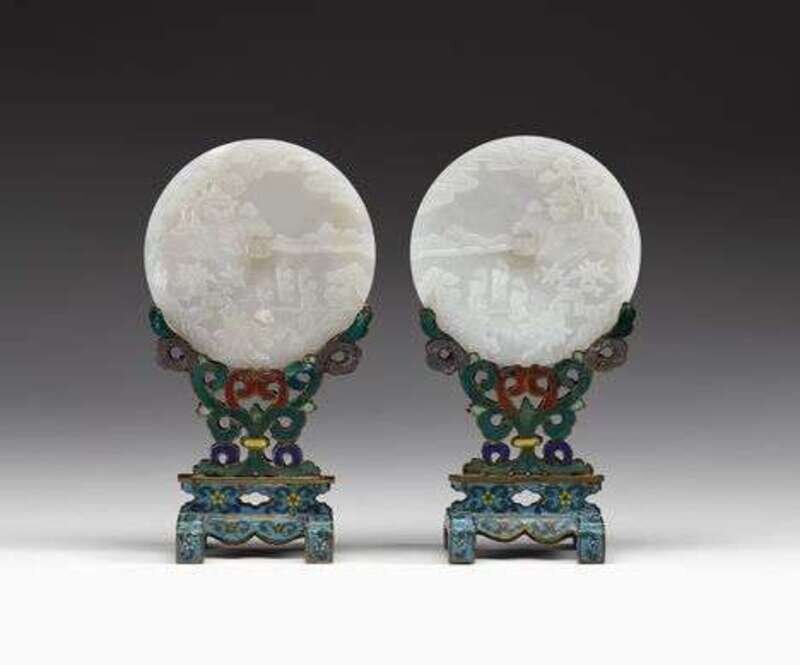 Of true white hue, circular disk carved in medium relief to show figural landscape among scrolling clouds, pine trees and pagoda mountains, incised and gilded qianlong mark verso, over fitted gilt-metal and cloisonne arch and bracket stands.