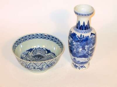 Chinese blue and white vase and bowl four kangxi mark, 19th century