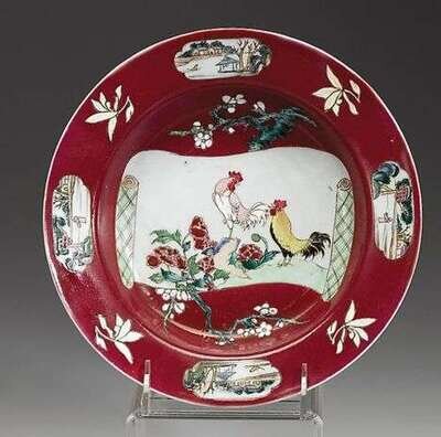 Fine Chinese puce backed 'cockerel' dish yongzheng period