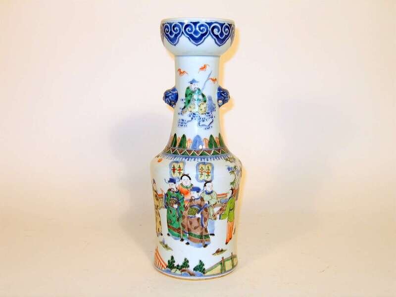 Of Kangxi style, ruyi band underglazed to U shape mouth, slender neck applied to show masks, cylindrical body enameled and underglazed to show figural landscape, buff unglazed recessed base.