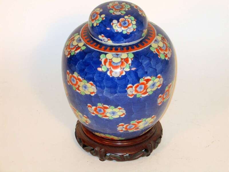 Of cylindrical form, domed cover yellow, green and iron-red enamel over blue underglazed, wood stand.