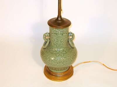 Converted into a lamp, cylindrical neck issues two mask handles supporting rings, compressed body all carved to show masks and foliate cartouches, gilt-metal mounts.
