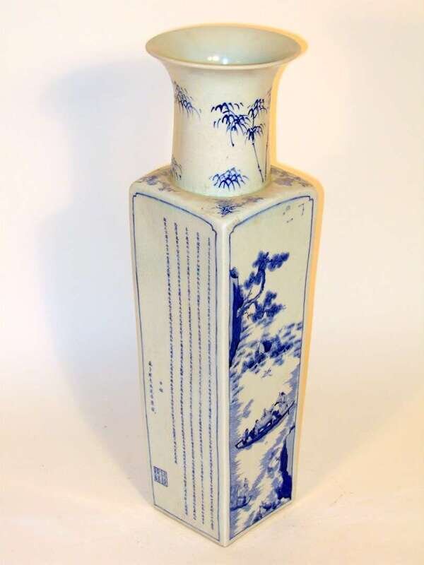 The flared mouth issues from a cylindrical neck, over a square tapering body, decorated in the Kangxi 'red cliff' manner with Su Dongpo's poem and figural depictions, recessed base and slight crazing underglaze.