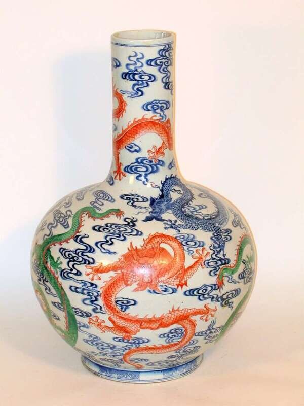 Of globular form, long slender neck issues from a bulbous body, green and iron-red dragons decorated with blue underglazed dragon and scrolling clouds.