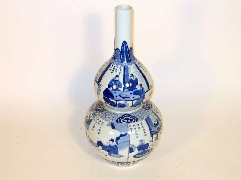 The long straight slender neck issues from a compressed double gourd body, neck painted to show leaf lappet, figural cartouches to body.