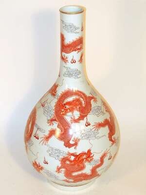 The long straight slender neck issues from a globular body, decorated to show iron red dragons and white enamel clouds, raised on a tall circular foot.