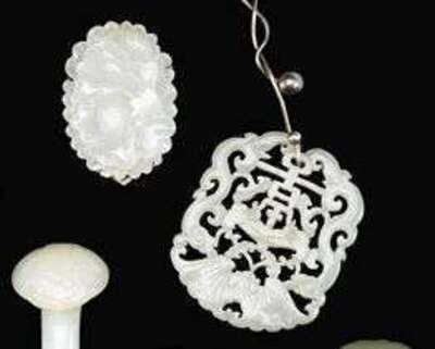 Comprised of a good white jade foliate carved pendant mounted in silver as a money clip, white jade reticulated oval penadant, and four mounted jadeite items.