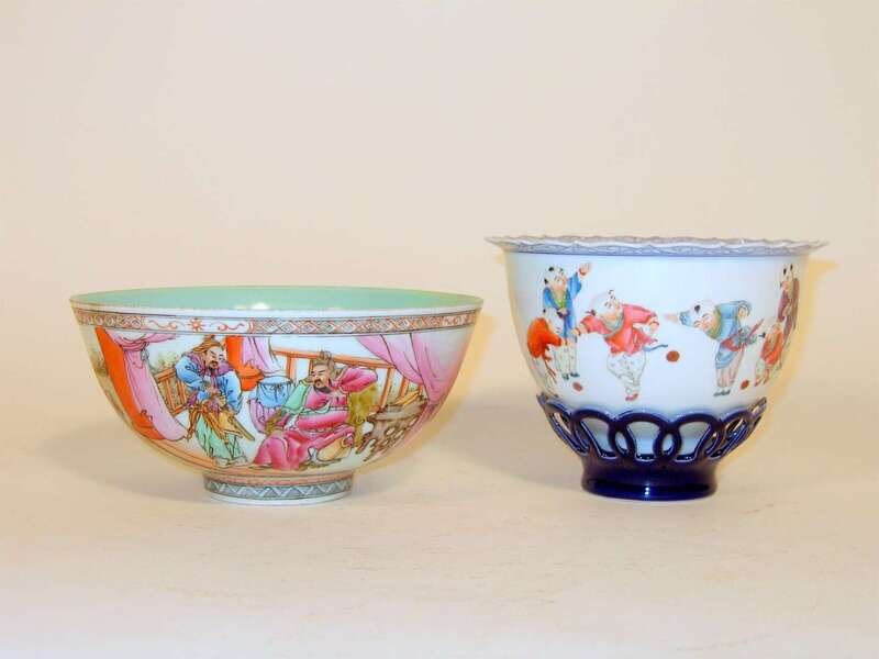 One of unusual separately potted base, free-moving U-shape bowl well painted to show boys at play, together with a famille rose bowl.
