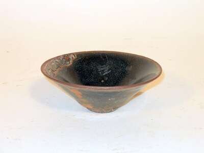 Of tapering cylindrical form, brown rim, brown/black glazed interior, raised on buff orange circular foot.