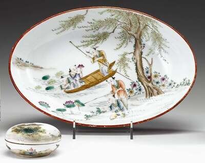 Of oval form, worked to show boys fishing to the interior, iron orange ground to the outer-wall of landscape cartouches, marked base, together with a famille rose circular paste box, showing carp and script.
