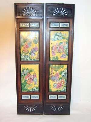 Tall rectangular form, enameled figural scenes are framed by blue and white plaques within a wood frame.